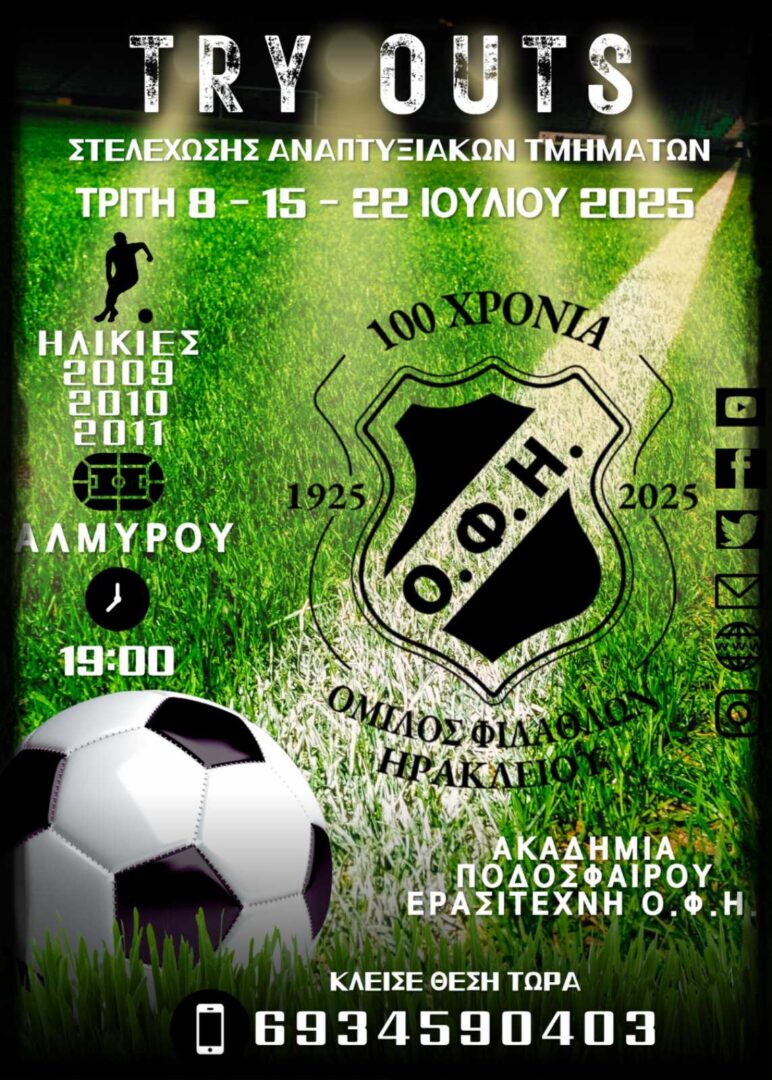 TRY OUTS που διοργανώνει την Τρίτη 8 – Τρίτη 15 και Τρίτη 22 Ιουλίου 2025 στο γήπεδο του Αλμυρού,